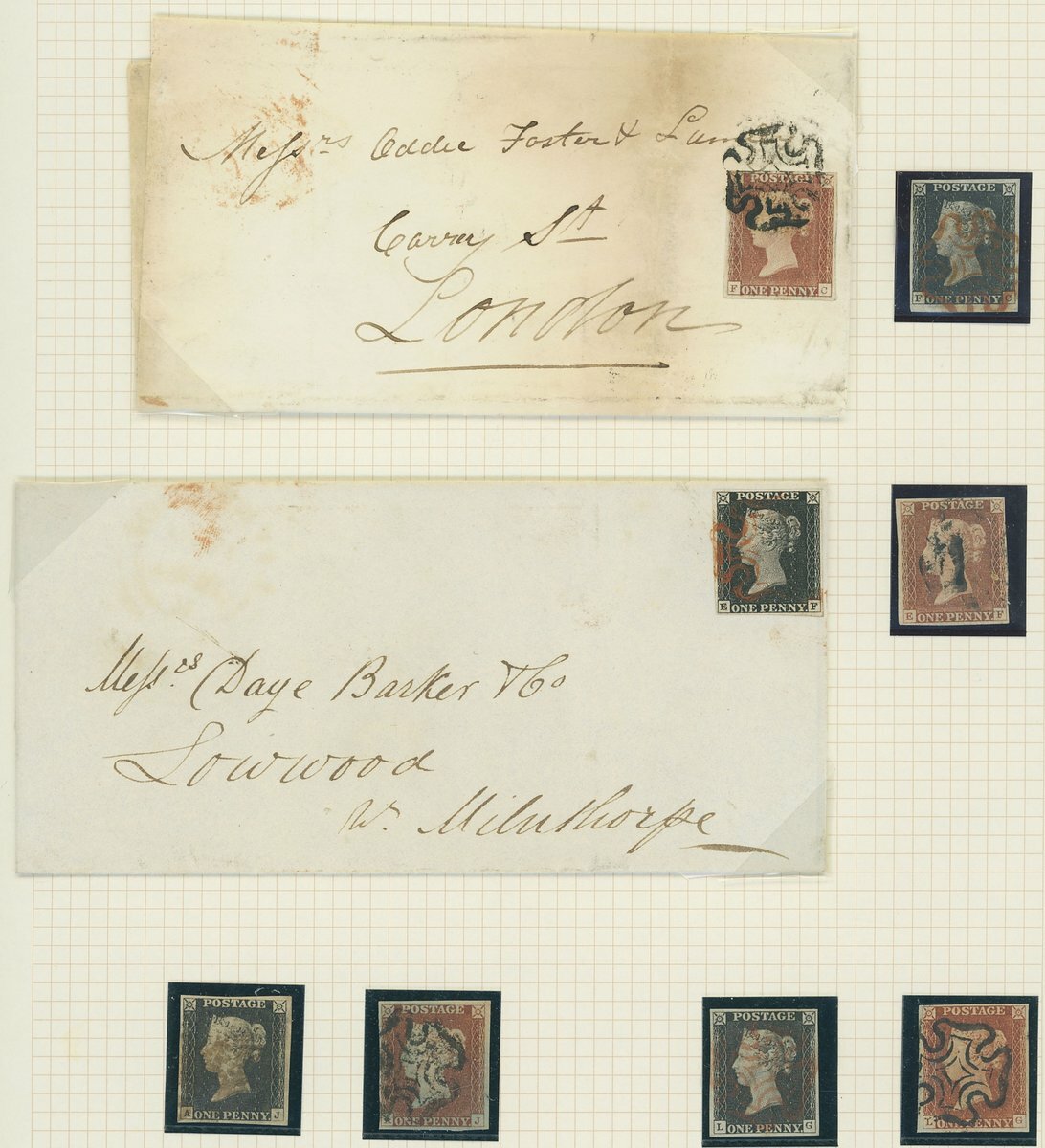 Four matched pairs: FC cancelled in red with 1d. red tied to 1841 (26 Aug) entire letter from Caernarfon to London; EF tied to 1840 (21 July) entire from Wigan to Milnthorpe with single 1d. red off cover; AJ and LG, both as singles off cover. All with four margins and a fine group.