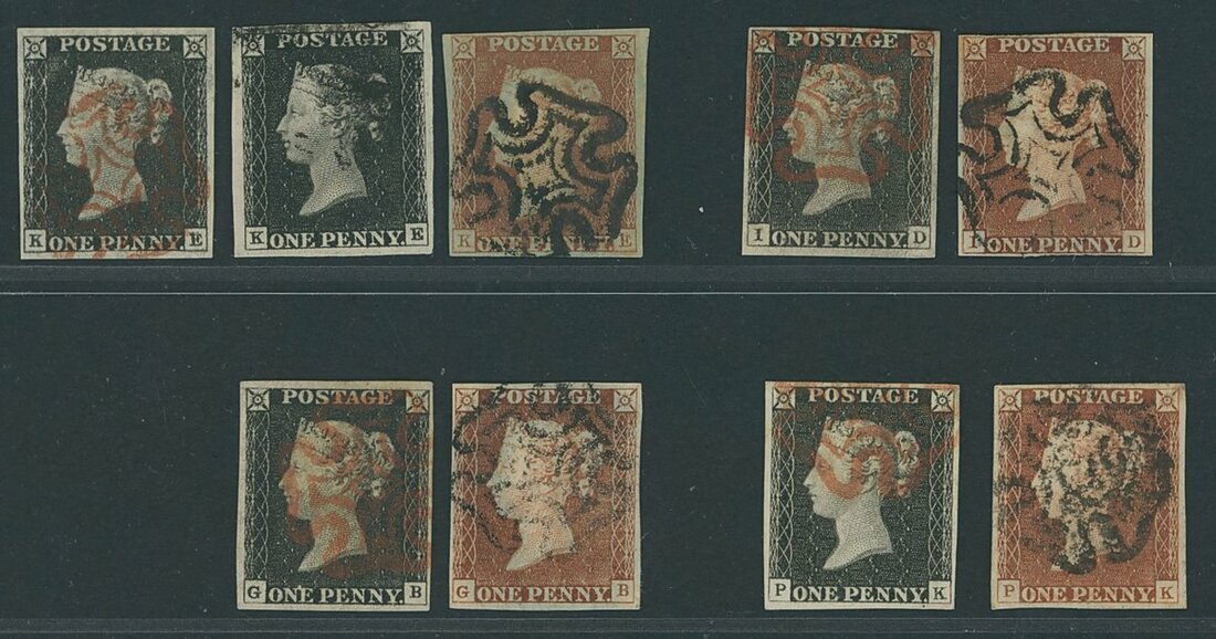 Four matched pairs: GB, ID, KE (with two 1d. blacks), PK. All blacks cancelled in red except one KE which is in black, all reds in black. All with four clear margins, large in places, one 1d. red with corner crease otherwise a fine and scarce group.