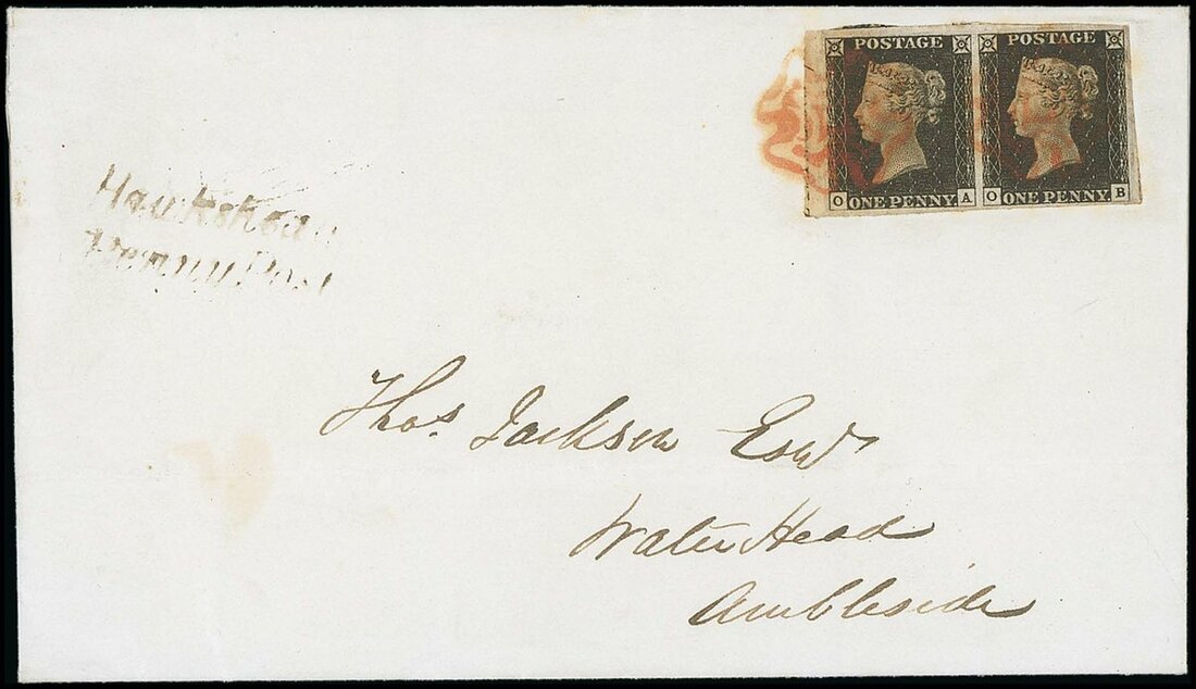 OA-OB horizontal pair, part of sheet margin and traces of inscription at left, large margins other sides and showing portions of two adjoining stamps, tied by red Maltese Cross cancellations to entire to Ambleside with Hawkhurst/Penny Post on the front and Ambleside c.d.s. of 29 Oct. 1840 on the reverse. Clean and spectacular