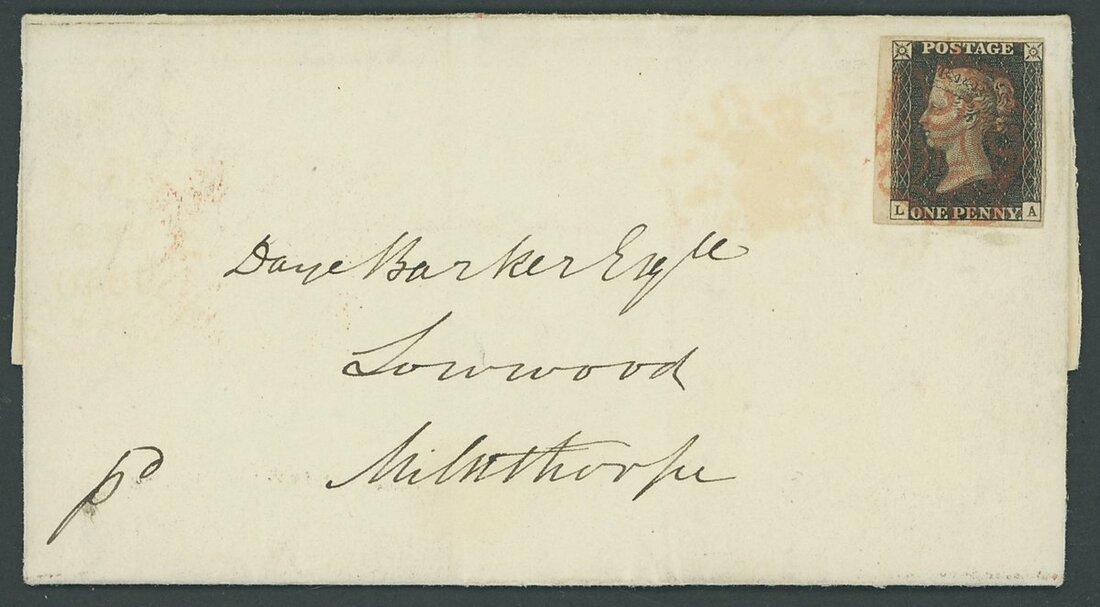 LA, part of sheet margin at left, close to large margins other sides, red Maltese Cross cancellation, on entire letter to Milinthorpe with red Manchester c.d.s. of 31 May 1840 on the reverse; fine and early use of Plate 3. Brandon Certificate (2022)
