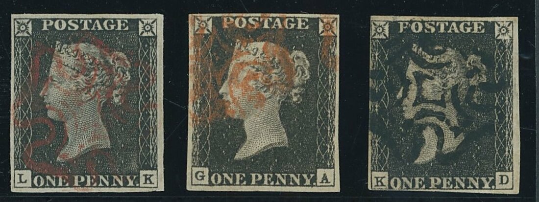 LK (worn impression), Plate 4: GA and Plate 10: KD, all with margins all round, the first two cancelled in red, KD with a tiny thin in the margin at top, fine