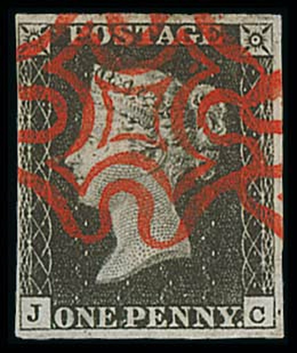 JC, good to large margins all round cancelled by superb strikes of Maltese Cross in bright vermilion shade; one or two small paper inclusions otherwise fine and most attractive.
