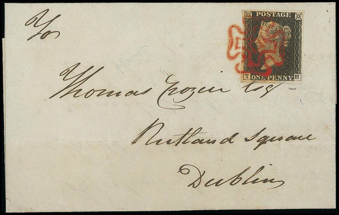 TH, good to large margins tied to 1840 (2 Jul.) small entire to Dublin by complete and upright Maltese cross in red,