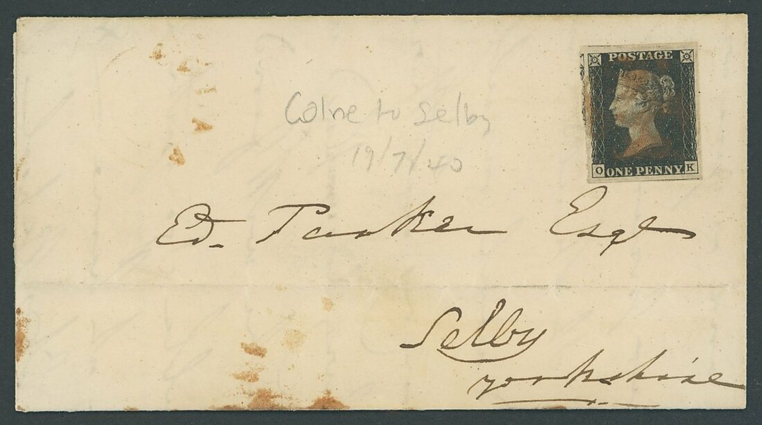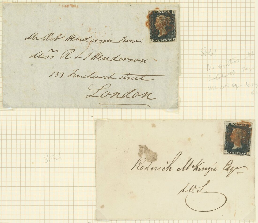 DF tied by red Maltese Crosses to 1840 (15 Dec.) entire from Stourbridge to Tewkesbury; QF just tied by red Maltese Cross to 1840 (Dec.) piece used within Edinburgh; FF tied by red Maltese Cross to 1840 (24 June) entire letter from Glasgow to London; FF tied by red Maltese Cross to 1841 (Jan.) Scottish entire; and OK, good to enormous margins on three sides, cancelled by red Maltese Cross and affixed to 1840 (19 July) entire letter to Selby. All with four margins, generally fine and a good group.