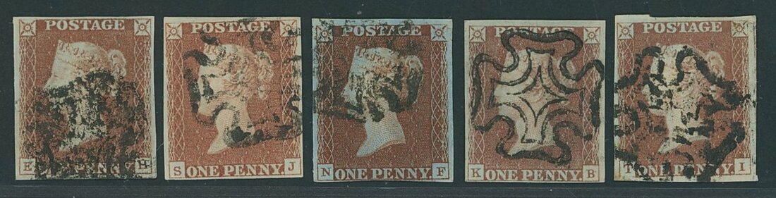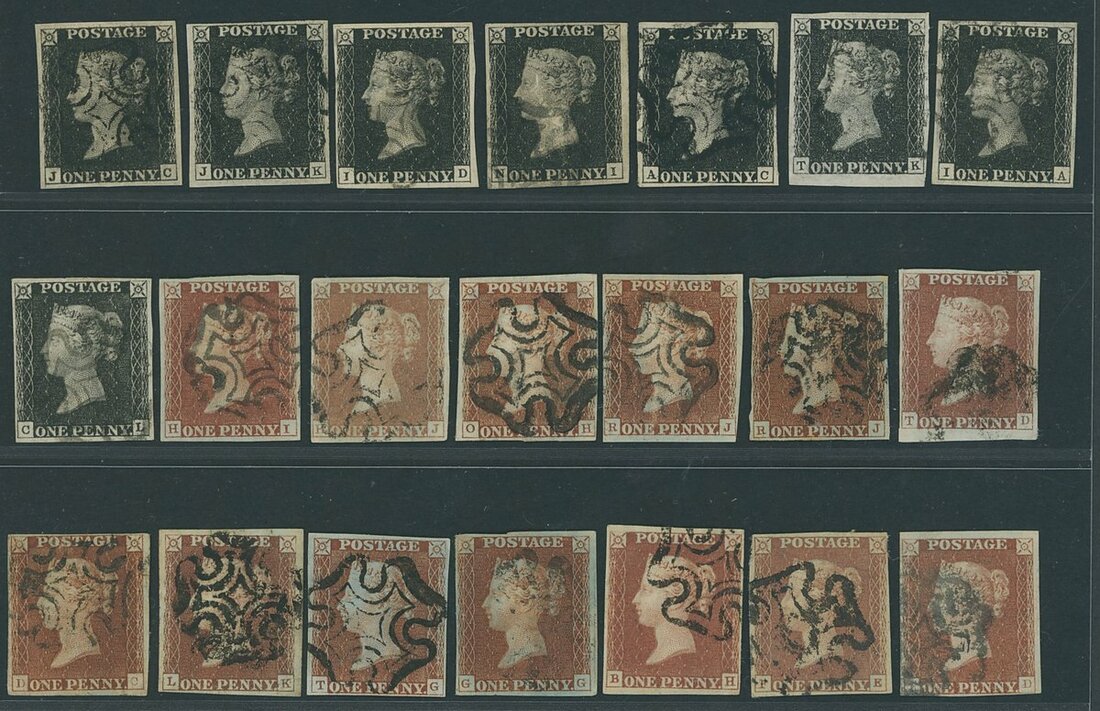 A used selection (8), all cancelled by black Maltese Cross, each four margined, generally good, with some very large in shades from deep to greyish and worn, one or two small imperfections though generally fine to very fine. Together with 1841-53 1d. red-brown (18) of the same plate, all cancelled by black Maltese Cross, almost all four margins with on or two faults. A valuable group.