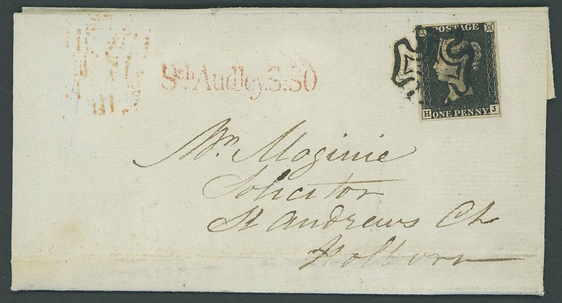 HJ, close to large margins all round, tied by a black Maltese Cross cancellation to London entire letter with red "Sth Audley.S.SO" alongside and datestamp of 14 Dec. 1840 on the reverse; filing fold at foot well clear of the adhesive, fine and a scarce cover used during the period of experimental use of the black Cross