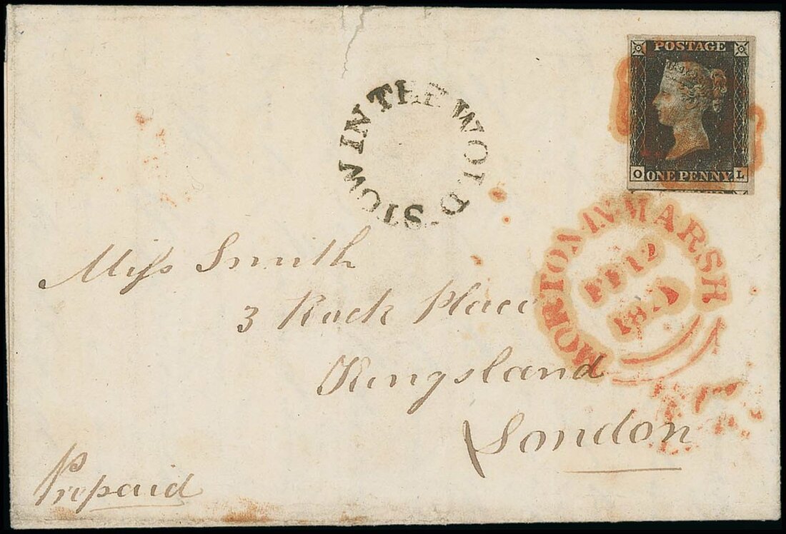OL, good to huge margins and showing a portion of the adjoining stamp at foot, tied by two red Maltese Cross cancellations to entire letter to London with black undated