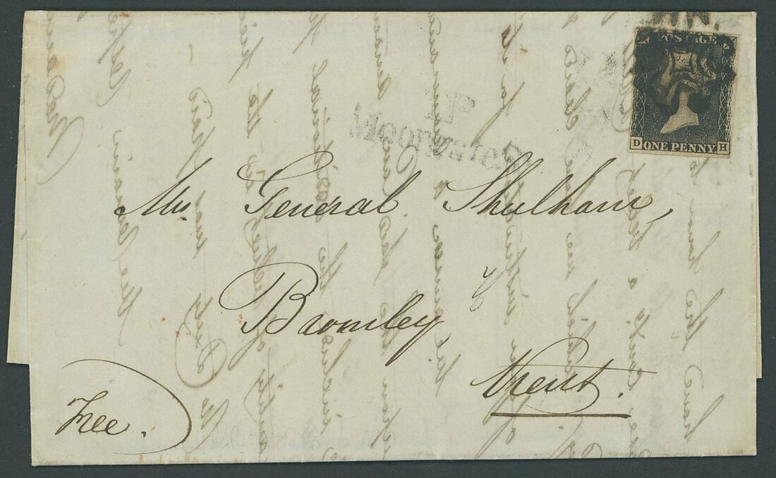 DH, greyish black shade, close to good margins all round, tied by a black Maltese Cross to entire letter (invoice from "Agents by Appointment to the Royal Academy") from London to Bromley with "TP/Moorgate St." alongside, red datestamp of 21 Nov. 1840 on the revere, intact red wax J&R/McC seal on the reverse. Scarce used during the period of the experimental black Cross
