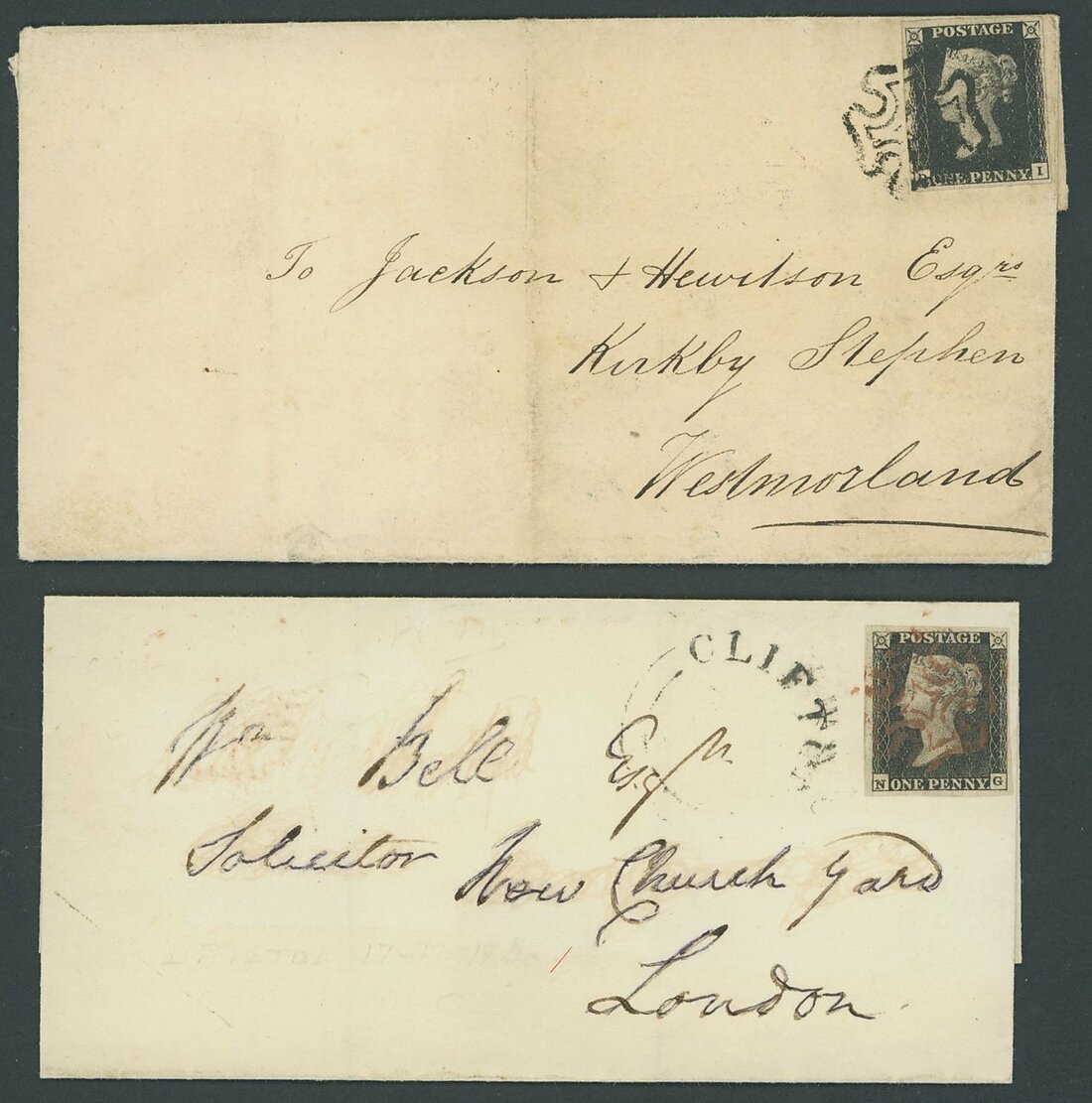 DI, margins all round, tied by black Maltese Cross cancellation to entire letter to Westmoreland, Richmond c.d.s. of 24 April 1841 and red framed "No.1" on reverse; also NG, good to large margins all round, tied by red Maltese Cross to entire to London with Bristol c.d.s. of 17 Dec. 1840 on the reverse; fine