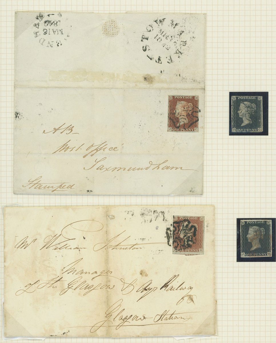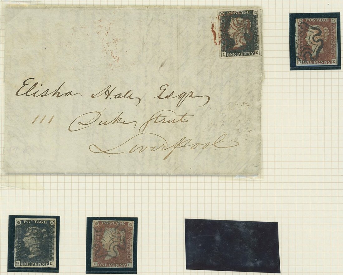 Seven matched pairs: EH with additional 1d. red, the 1d. black cancelled by red Maltese Cross, both reds in black; EL, both of cover, cancelled by black Maltese Cross; JC off cover, cancelled by Black Maltese cross with 1d. red tied to 1842 (16 March) to Saxmundham; JH off cover cancelled by red Maltese Cross with 1d. red tied to 1841 (19 July) entire letter used within Glasgow; IE tied by red Maltese Cross 1840 (11 Dec.) entire letter from Manchester to Liverpool with matched 1d. red off cover cancelled in black; QJ tied by black Maltese Cross to small piece and 1d. red off cover also cancelled in black; RL tied by red Maltese Cross to small piece with 1d. red tied to 1841 (3 Sept.) entire letter from Liverpool to Denbeigh; All adhesives with four clear margins, generally fine and scarce.