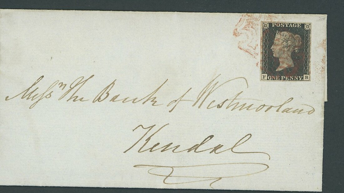 FB, close to large margins all round, tied by two lightly struck red Maltese Cross cancellations to entire to Kendal with Ulverstone c.d.s. of 16 Jan. 1841 on the reverse; fine. B.P.A. Certificate (2009)
