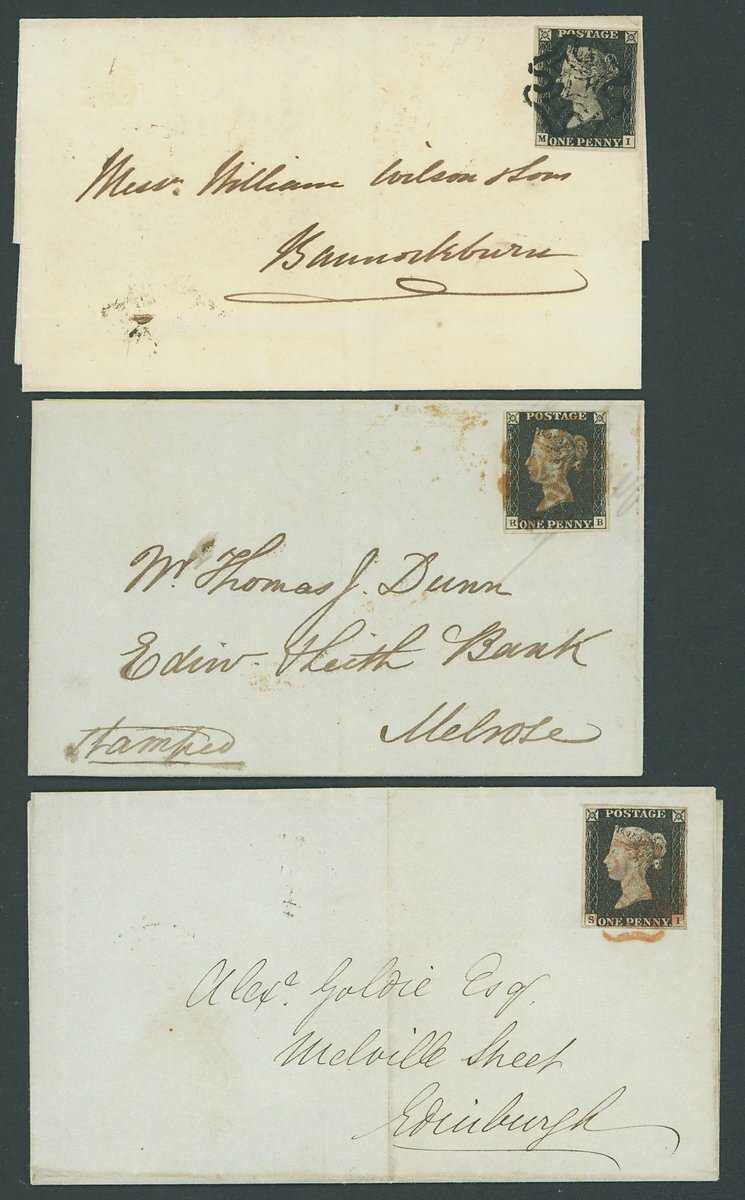MI tied by black Maltese Cross to 1841 (29 Aug.) entire from Stirling to Bannockburn; RB tied by red Maltese Cross to 1841 (25 Feb.) entire letter from Earlston to Melrose; and SI, clear margins all round tied by red Maltese Cross to 1840 (31 July) entire to Edinburgh. All adhesives with clear margins all round, a fine trio.