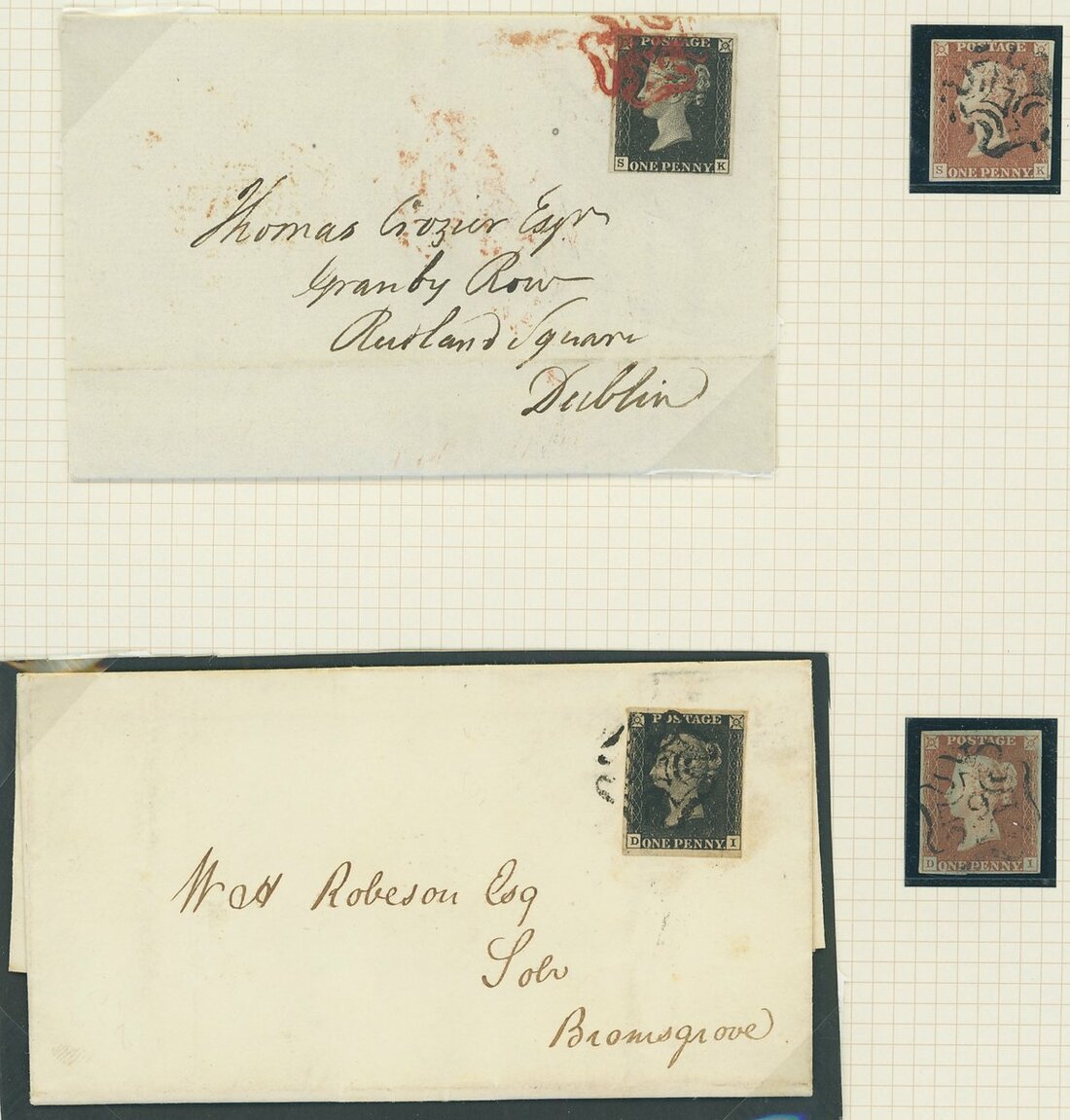 SK tied by red Maltese Cross to 1840 (3 Nov.) entire letter from Hillsboro to Dublin (adhesive possibly lifted and removed), with matched 1d. red off cover, cancelled by black Maltese Cross; also DI tied by black Maltese Cross to 1841 (15 March) entire letter from Cirencester to Ramsgate with matched 1d. red off cover, cancelled by number '9' in Maltese Cross. All adhesives with four clear margins, fine and scarce.