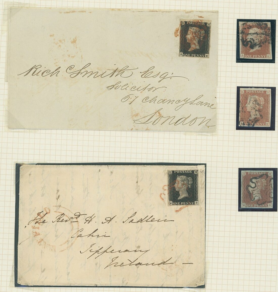 AK, close to very large margins tied by red Maltese Cross to 1841 (9 Feb.) entire from Rochdale to London together with two matched 1d. reds off cover; also MB, good margins all round, tied by red Maltese Cross to 1841 (6 Feb.) entire letter from Hatfield Ireland, together with matched 1d. red off cover