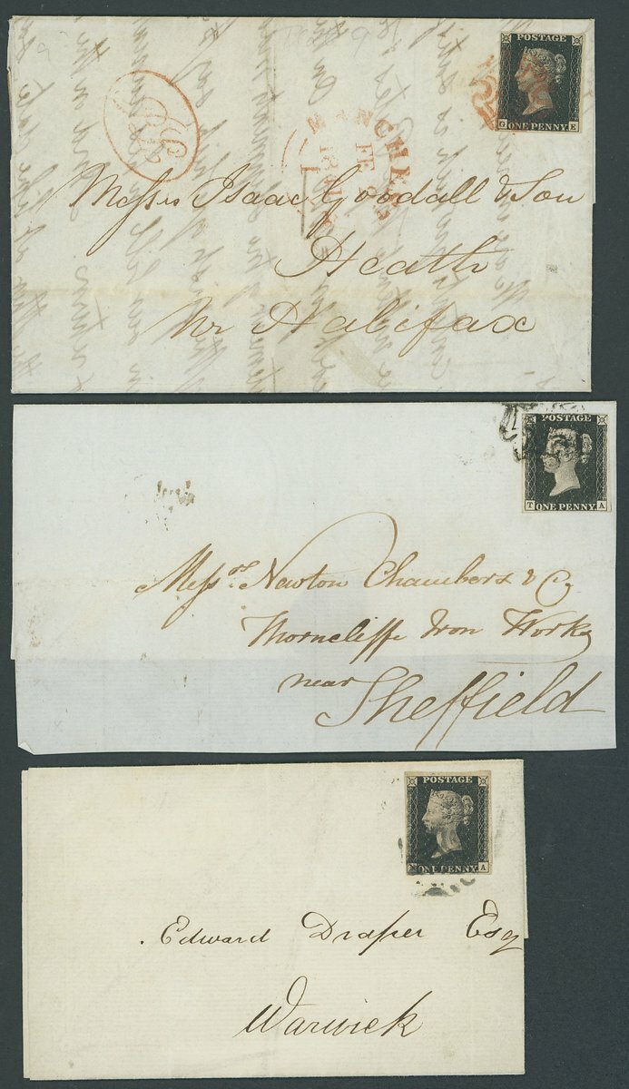 GE, good to large margins all round, tied by red Maltese Cross to entire letter from Manchester to Heath dated 2 Feb. 1841, NA, good to large margins, tied by black Maltese Cross cancellation to entre letter from Coventry to Warwick dated 23 July 1841, TA, close to large margins and showing a trace of the adjoining stamp at lower right, tied by black Maltese Cross cancellation to front with large part of back flap from London to Sheffield dated 17 Feb. 1841; good to fine (3 items)