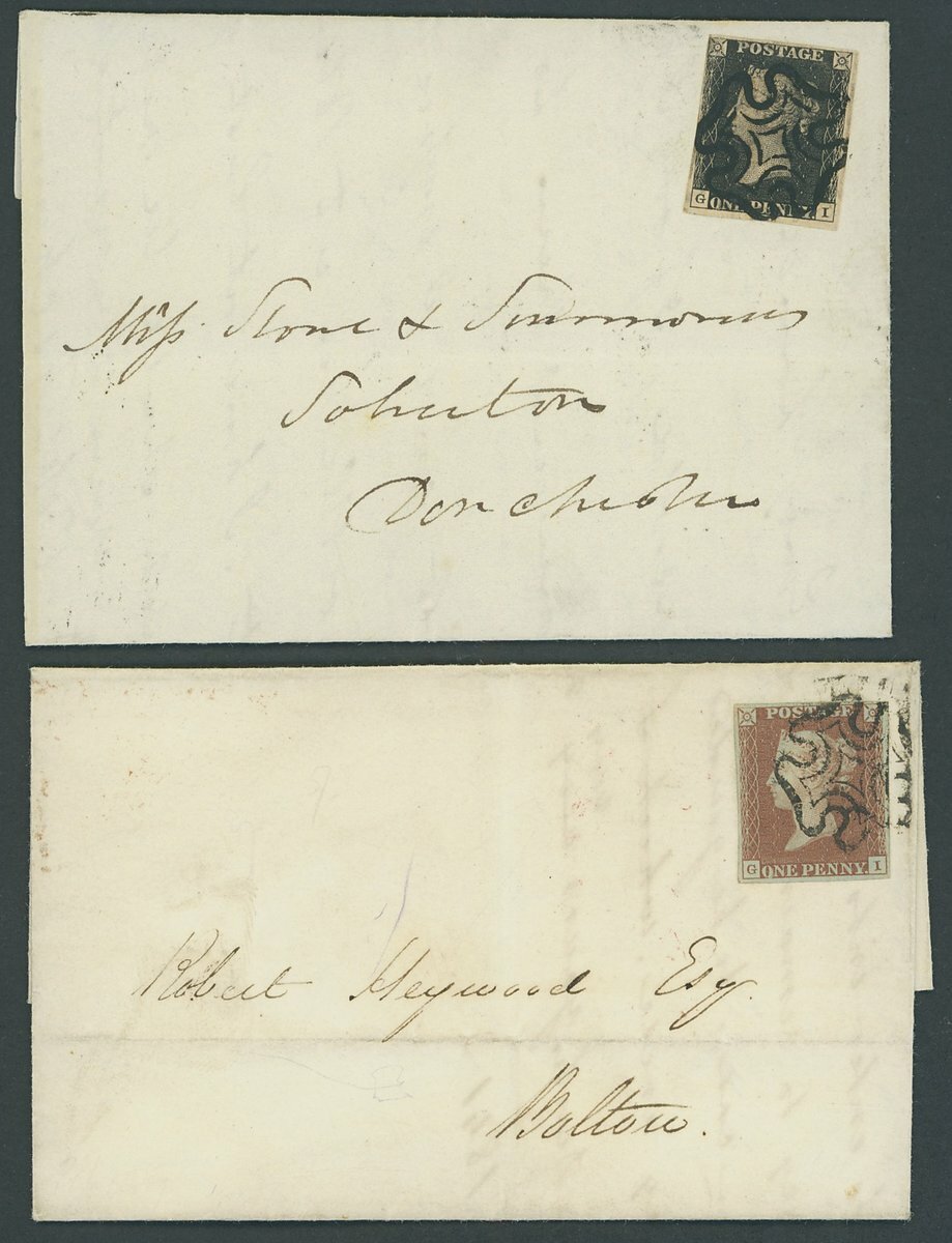 GI, clear margins all round - just touching at left - well cancelled by black Maltese Cross and affixed to 1841 (16 June) entire letter from Blandford to Dorchester; together with matched 1d. red tied by black Maltese Cross to 1841 (6 July) entire letter from Manchester to Bolton. A fine duo.