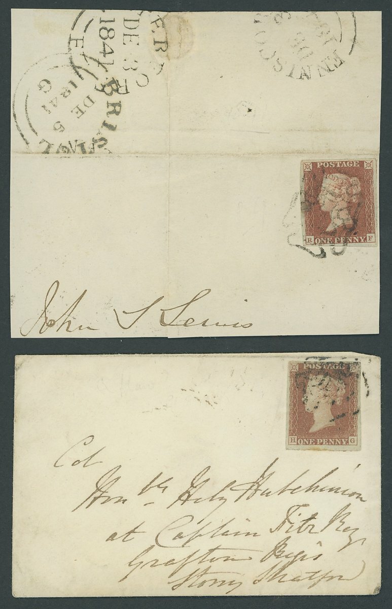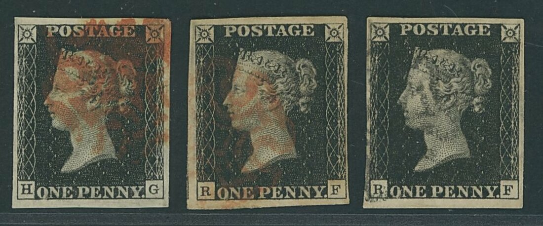 HG, good to large margins all round, cancelled by red Maltese Cross with matched 1d. red tied by black Maltese Cross to 1841 (23 March) envelope to Stony Stratford; RF (2), both good to very large margins, one cancelled by red, the other by black Maltese Cross, together with matched 1d. red tied to 1841 (3 Dec.) piece. A fine group.