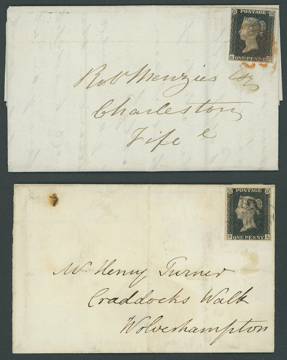 KG, touched at left, tied by red Maltese Cross to entire letter to Fife, London c.d.s. of 11 Jan. 1841 on the reverse; also SA, good to large margins all round on entire (no side flaps) to Wolverhampton with c.d.s. of 8 May 1841 on the reverse; a few minor imperfections