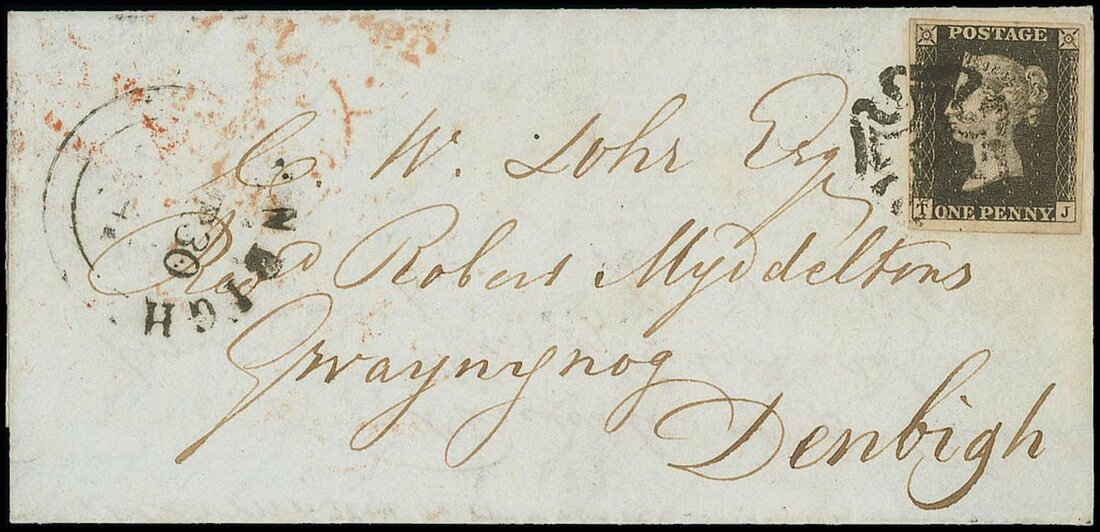 TJ, good to huge margins all round, tied by a black Maltese Cross cancellation to entire letter with Denbigh arrival datestamp on the front and red Norwich despatch c.d.s. on reverse; attractive and scarce