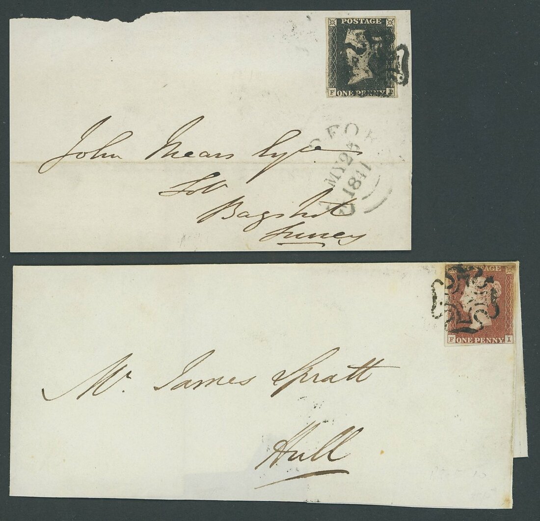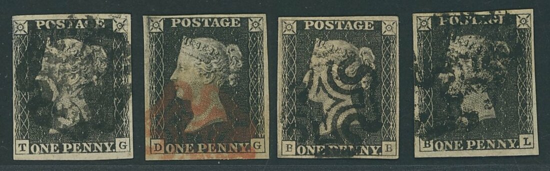 Four examples: BB, BL, DG and TG; DG cancelled by red Maltese Cross, the rest cancelled by black Maltese Cross. Also FI tied by black Maltese Cross to 1841 piece with matched 1d. red tied to 1841 piece. All with four clear margins, three of which with large margins on at least one side, some small faults though the DG fine.