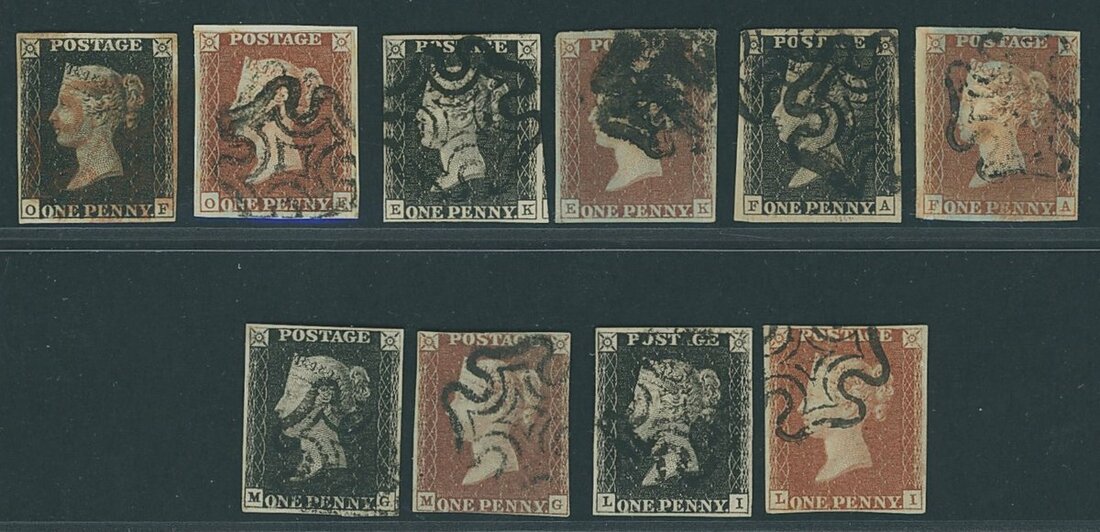 Five matched pairs: EK, FA, LI, MG and OF, the latter cancelled by red Maltese Cross, the rest cancelled by black Maltese Crosses; all with four clear margins, some very large with EK showing portion of the adjoining stamp at right, one or two small faults confined to the 1d. reds though generally fine to very fine.