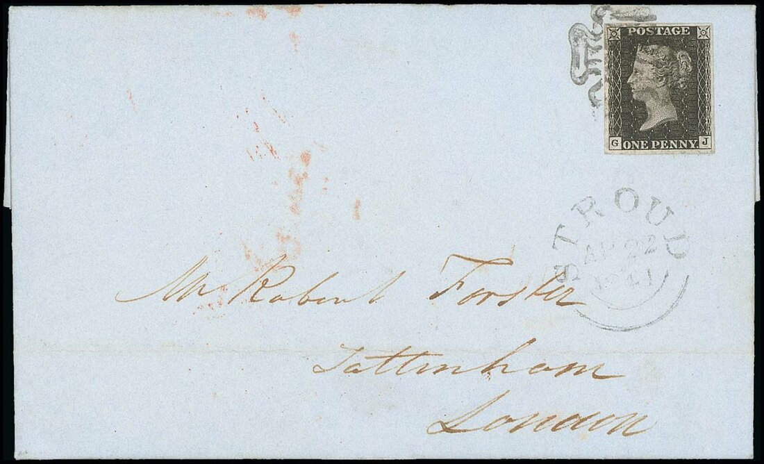 GJ, black shade with large balanced margins on all sides, tied by a fine upright black Maltese Cross cancellation to entire letter from Stroud to London, dated 22 Aug. 1841; clean horizontal filing at foot, well clear of the adhesive. Very fine. A wonderful cover from this rare Plate. Photo
