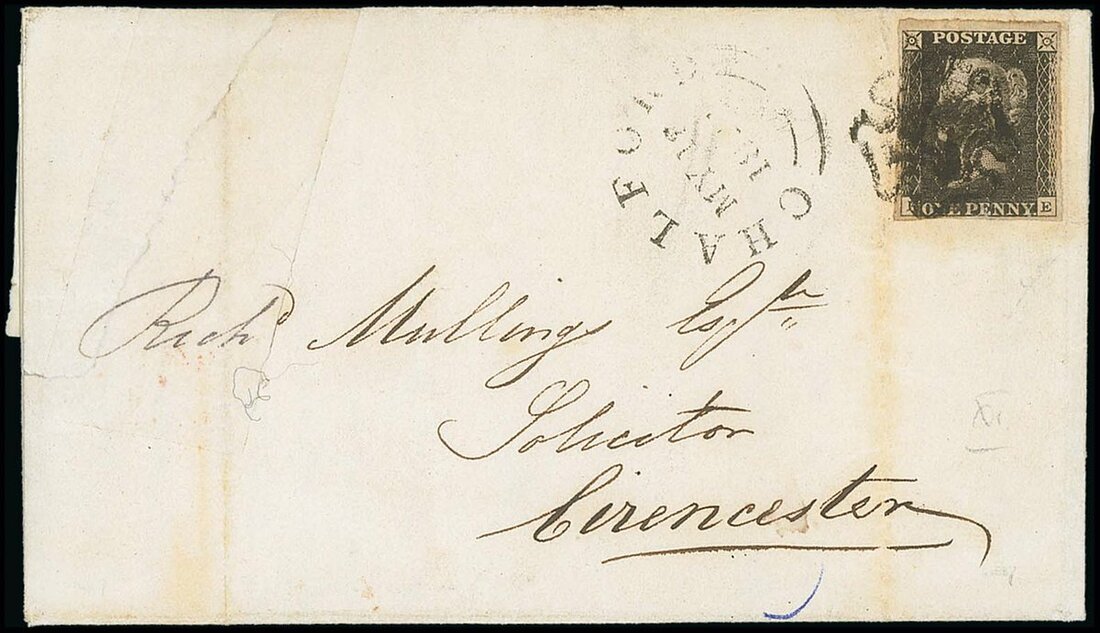 RE, typical greyish-black shade, close to large margins all round, tied by a black Maltese Cross cancellation to entire letter to Cirencester with Chalford c.d.s. of 18 May 1841 alongside, dated markings and an u.d.c. on reverse; the entire a little stained and with some tears strengthened by tape. Rare. R.P.S. Certificate (1986)