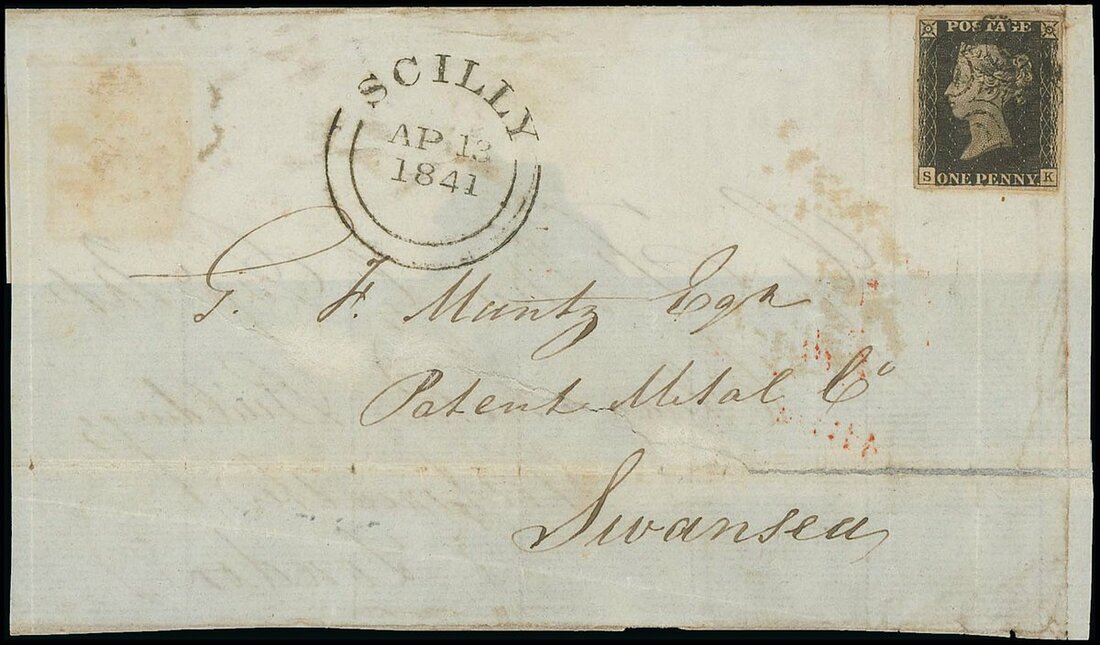 SK, black shade, large margins all round, tied by black Maltese Cross to front addressed to Swansea with Scilly c.d.s. of 13 April 1841 alongside; the original entire was then "turned" and a Penny Black Plate 6: JE, grey-black shade (some faults) applied, cancelled by another black Cross and addressed to London; the front with filing folds but most remarkable use of the rarest Penny Black Plate from the Scilly Islands and then being "turned"