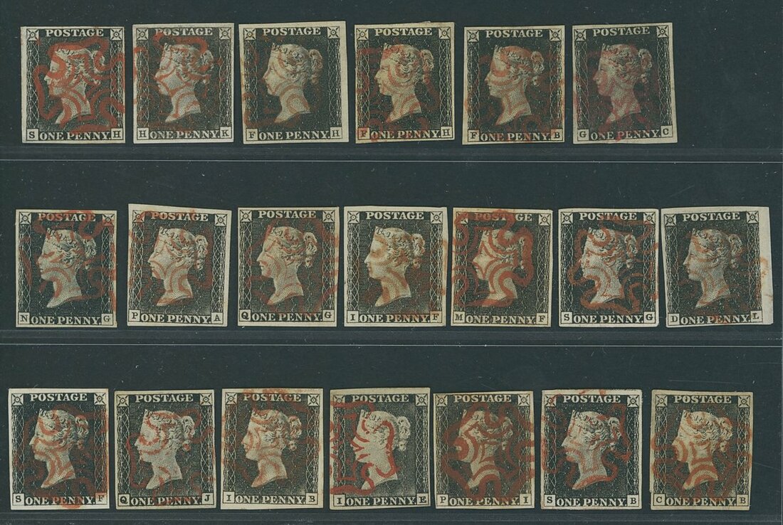 1a and 1b: A used selection (20), all cancelled by virtually complete red Maltese Crosses, all four margins, some with very large margins, fine to very fine and a valuable group.