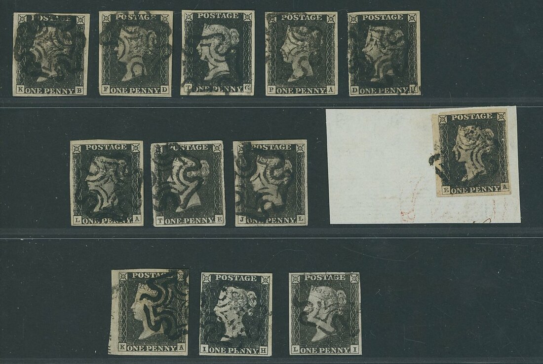 1a and 1b: A used selection (12), all cancelled by black Maltese Crosses, one tied to piece; all with four margins, two with very large margins, one showing part sheet margin at left. Generally fine to very fine and a valuable group.