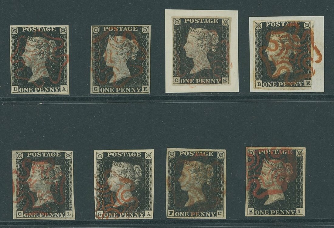 A selection of eight, all with margins all round and red Maltese Cross cancellations; good to very fine