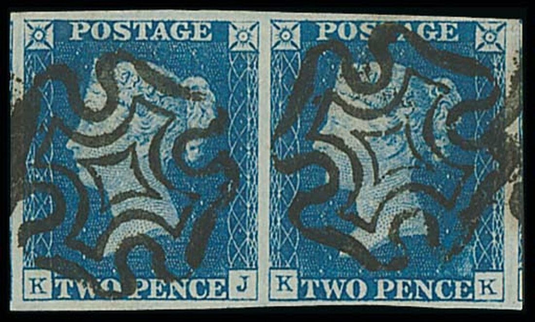 KJ-KK, horizontal pair, good to huge margins all round and showing portions of the adjoining stamps at left and right, crisp black Maltese Cross cancellations, fine and a most appealing pair. Photo.