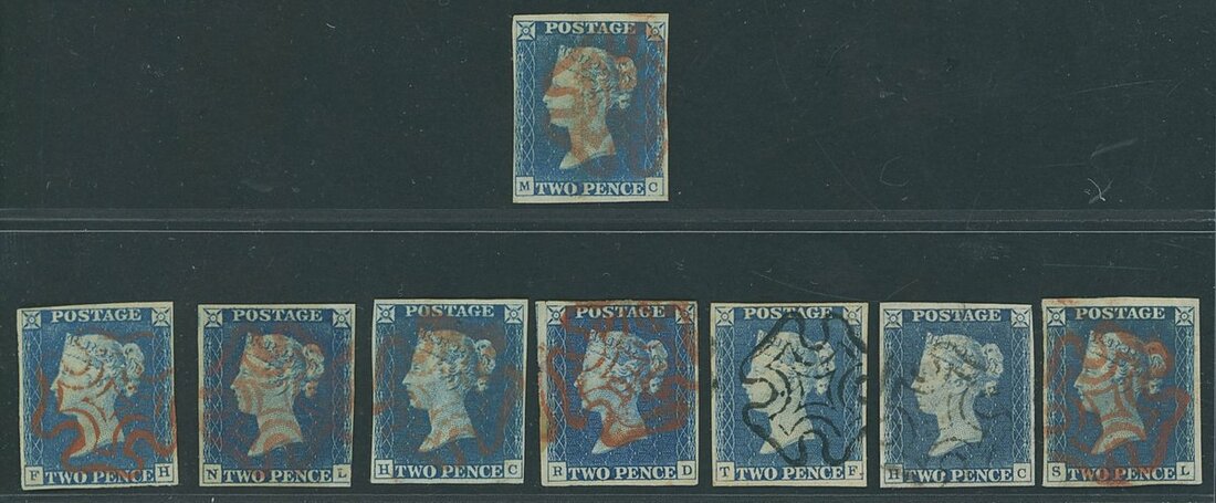 Plate 1: MC cancelled in red; Plate 2: five cancelled by red, and two in black. All with four clear margins though most with small faults, nevertheless a valuable group.