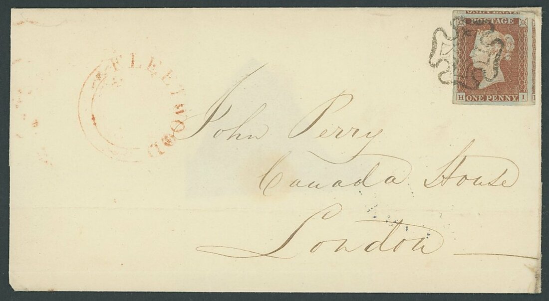 Plate 26: HI, large to enormous margins all round showing portions or traces of three adjoining stamps, tied by a crisp black Maltese Cross cancellation to entire (part of reverse missing) to London with red Fleetwood u.d.c. alongside, dated markings on reverse; fine
