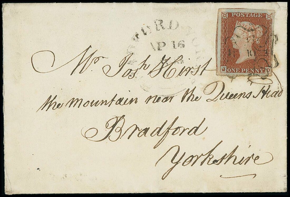 Plate 27: JD, "J" flaw, good to huge margins and showing traces of two adjoining stamps, tied by an upright number 10 in Maltese Cross cancellation to mourning entire to Yorkshire, with Bradford Yorks c.d.s. of 16 April 1843 alongside; fine and very early use of the "10" in Cross cancellation, just three days after the earliest recorded