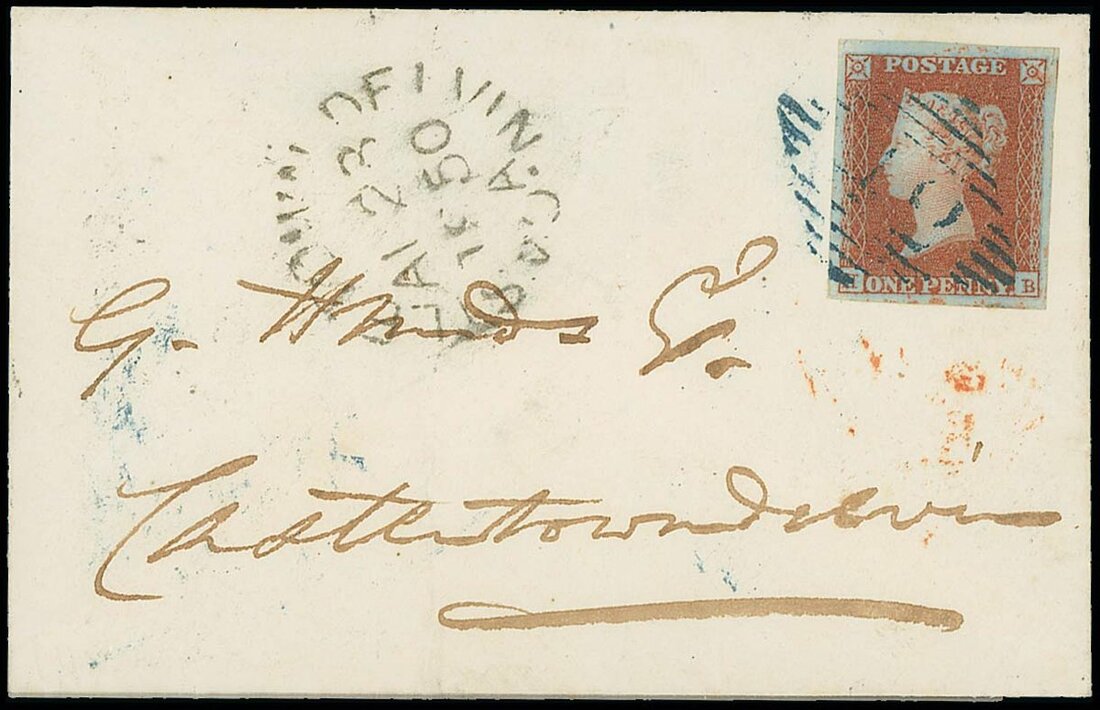 Plate 100: HB, large to very large margins all round, tied to small envelope, dated 22 Aug. 1850, addressed to Castletown Delvin by a rich blue Irish "42" numeral of Ballyglass with matching c.d.s. on reverse and arrival datestamp on the front; very fine. Specialised B1xb