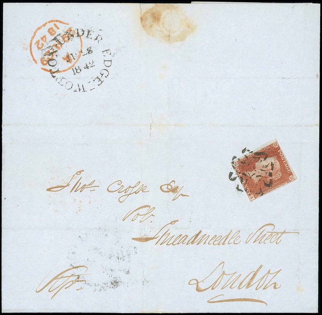 RA, close to large margins all round, just shaving the frame line at the upper left, tied by superb Wotton-Under-Edge distinctive Maltese Cross in black to 1842 (28 June) entire letter to Threadneedle Street, London, the reverse with clear "