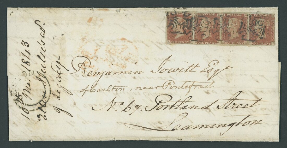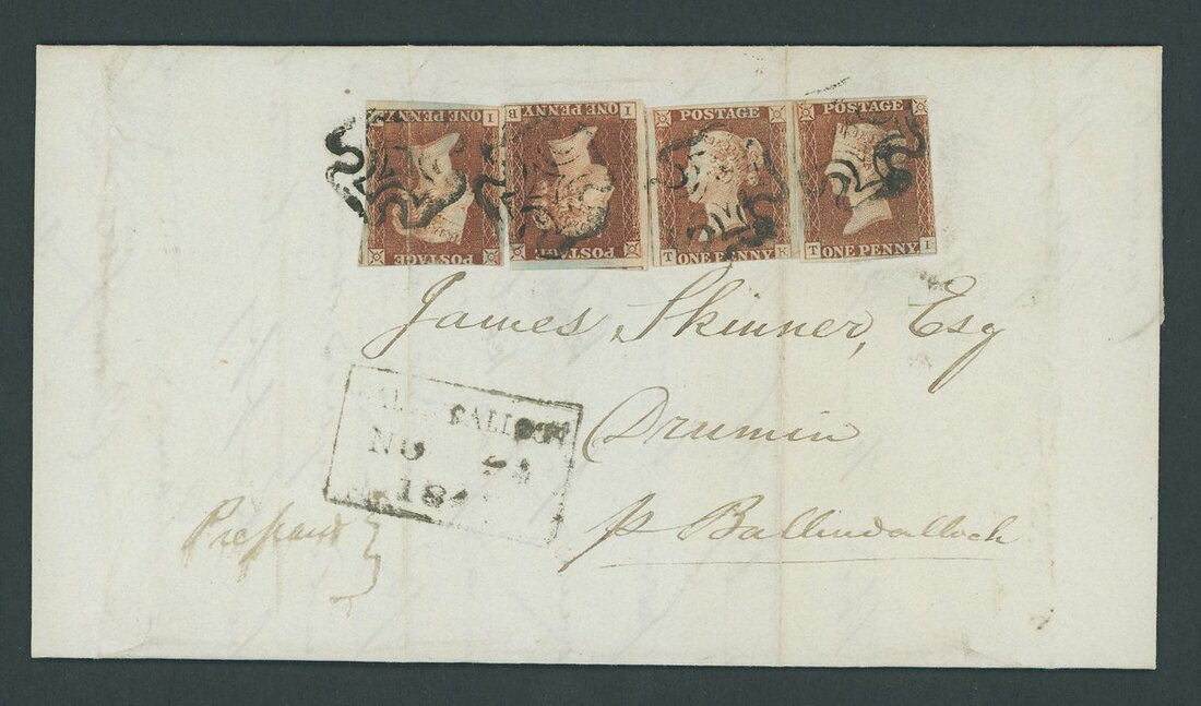 1841 (20 Nov.) entire letter from Elgin to Ballindalloch bearing four singles tied to eachother and entire by black Maltese Crosses; also 1843 (22 Oct.) entire letter from London to Leamington bearing horizontal strip of four. A fine and scarce duo.