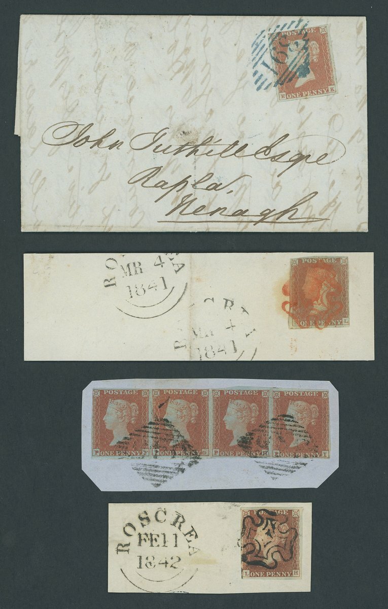 A small group (4) comprising: Pl. 70, EK, touched at top, good to large margins other sides, tied to entire letter, dated 21 Dec. 1847, addressed to Nanagh by a fine blue Irish "391" numeral cancellation of Rathkeale; fine. Specialised B1xb; also an example lettered SL cancelled by red Maltese cross on piece; LH on piece tied by black Maltese cross and with