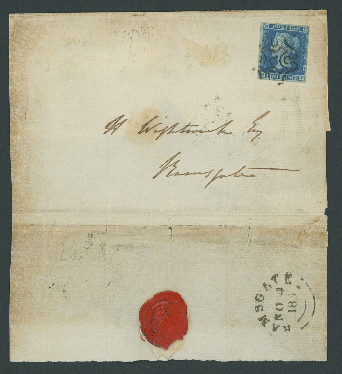 NF, good to very large margins and showing a trace of the adjoining stamp at left, tied by a good strike of the number "7" in Maltese Cross to entire (no side flaps) to Ramsgate with dated markings of Nov. 3 and 4 1846 on the reverse; the entire with stained and faults