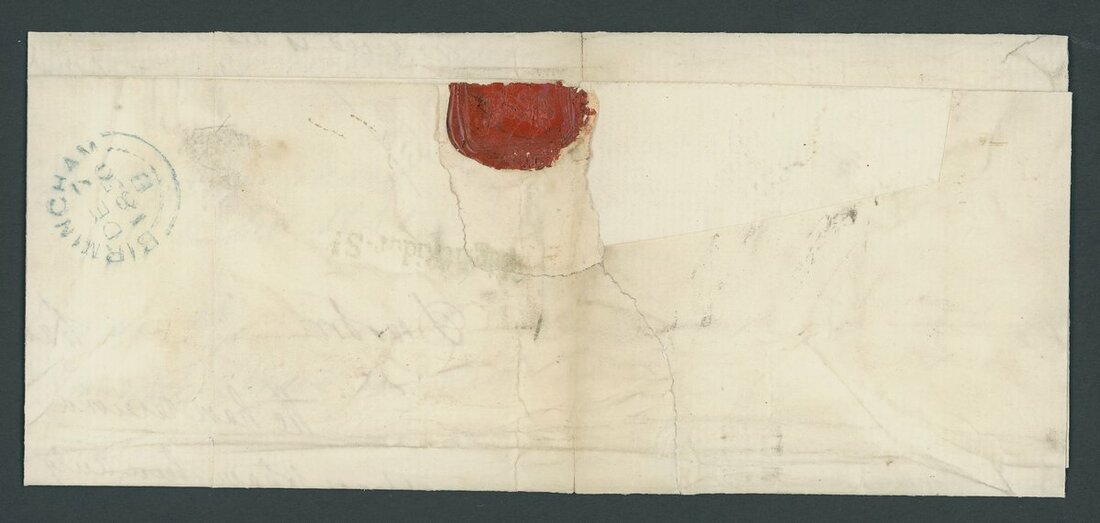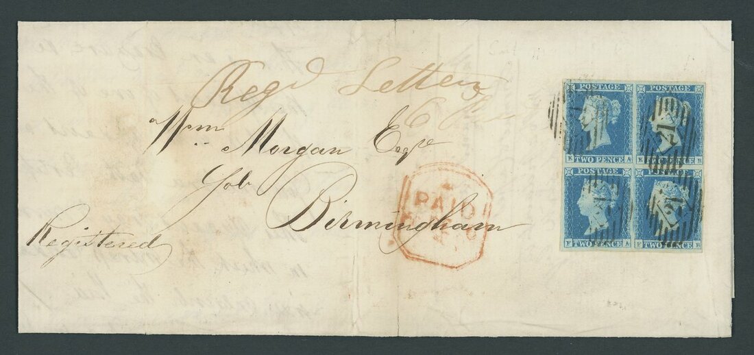 EA-FB, block of four, small to large margins all round, tied to entire letter Registered from Doctors Commons by London Inland section "21" barred oval cancellations, Birmingham arrival of 7 Dec 1850 on the reverse; two vertical filing folds well clear of the adhesives and a small portion missing from the reverse. Rare