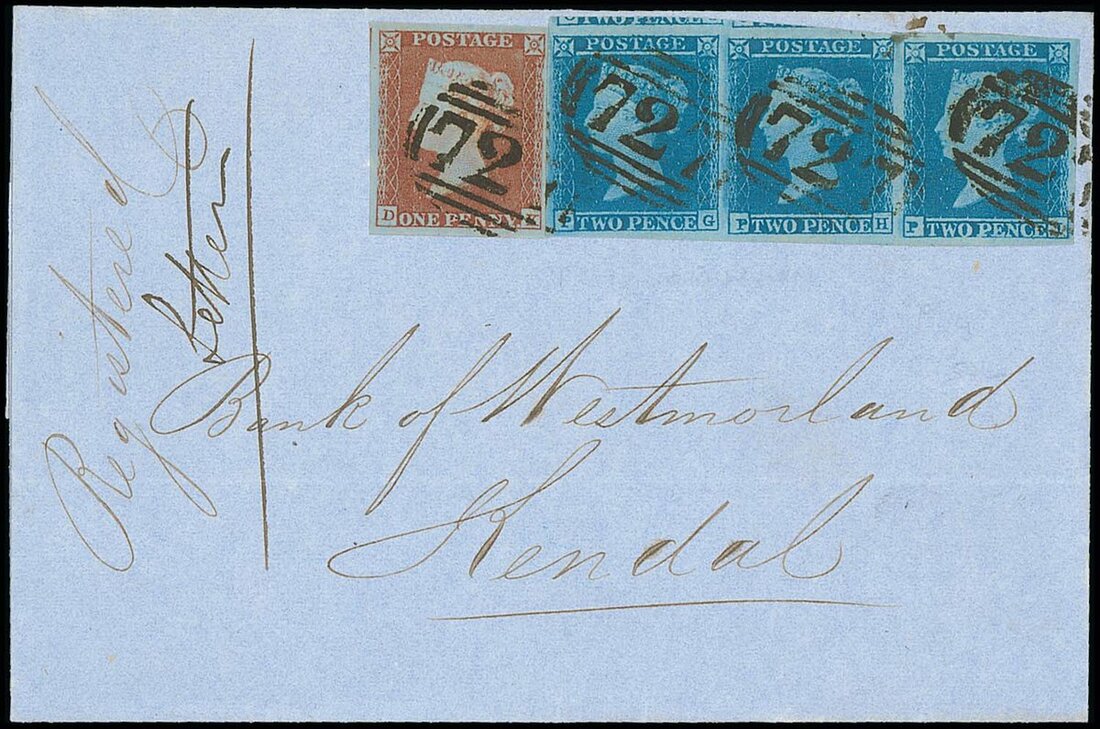 PG-PI, horizontal strip of three, PG recut side lines, good to very large margins all round and showing portions of two adjoining stamps at top, with 1d. Red-Brown, tied by "727" barred oval cancellations of Spalding to entire Registered to Kendal, dated markings of 22 Aug. 1851 on the reverse; very fine and scarce. B.P.A. Certificate (1996)