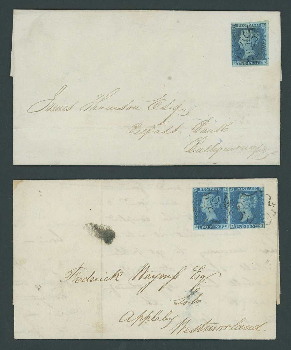 AH-AI horizontal pair, close or just touched at top, good margins other sides, tied by two number "12" in Maltese Cross cancellations to refolded entire letter to Westmorland dated 4 May 1843; and FL, three good margins and cut-into at left affixed to 1843 (11 Sept.) entire to Ballymoney,