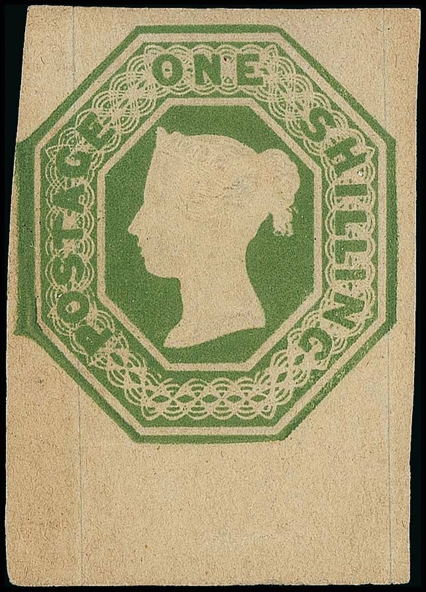 1/- green, Die I, clear margins all round with large sheet margin at foot, showing variety threads 20mm. apart, large part original gum, clear impression and especially fresh, deep colour. An important rarity, unique in private hands. Magnificent. B.P.A. Certificate (2021). Spec. H1(2)c, unpriced.
