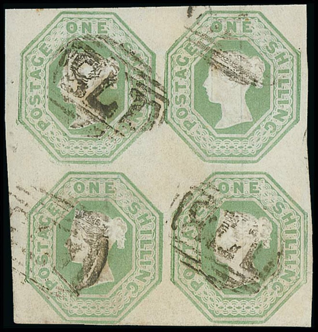 1/- pale green Die II block of four cancelled by '175' barred numerals, clear margins all round, a little tight at foot, though generous on all other sides. A rare and fine multiple. Spec. H1(1), £7,000 as block of four, S.G. 54ii, £4,400 as used singles.