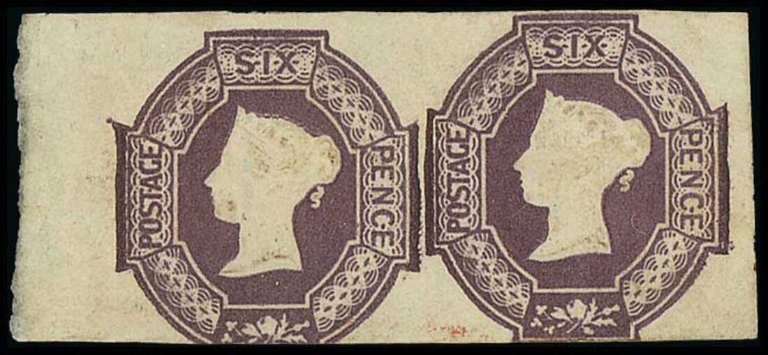 6d. purple, watermark reversed horizontal pair from the left of the sheet, unused without gum, cut into or touching at foot though with clear margins elsewhere, an attractive and very rare multiple. Spec. H3(3), S.G. 60, £24,000