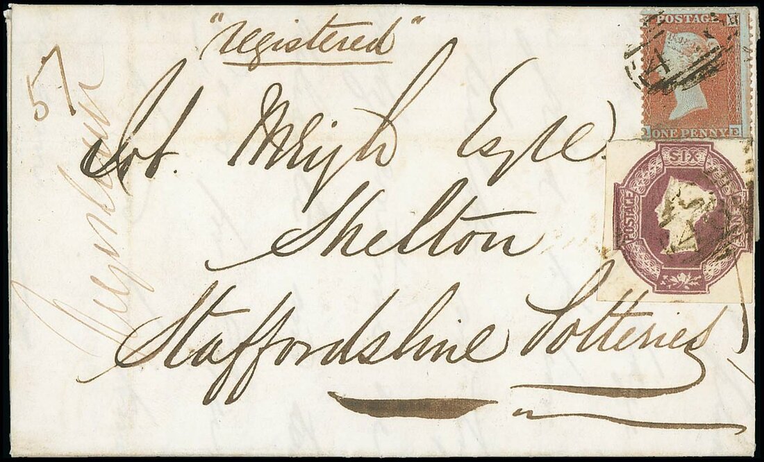 6d. purple, clear margins all round, just touching the outer frameline at right, affixed atop 1854-57 1d., both tied by by '466' barred numeral to 1855 (8 March) entire letter from Liverpool to Shelton, endorsed "Registered", and number "57", the reverse with Liverpool d.s. fine and scarce.