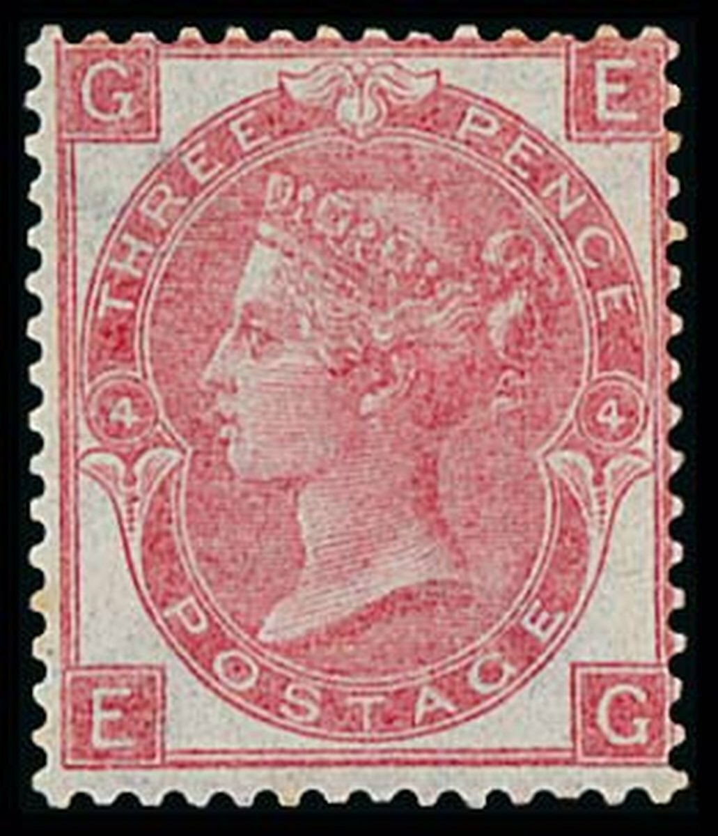 3d. rose, EG, Plate 4, large part original gum, light bend at upper right mentioned for the sake of accuracy only, otherwise of fresh colour not often found for this scarce stamp. B.P.A. Certificate (2018). Spec. J28, S.G. 92, £1,800