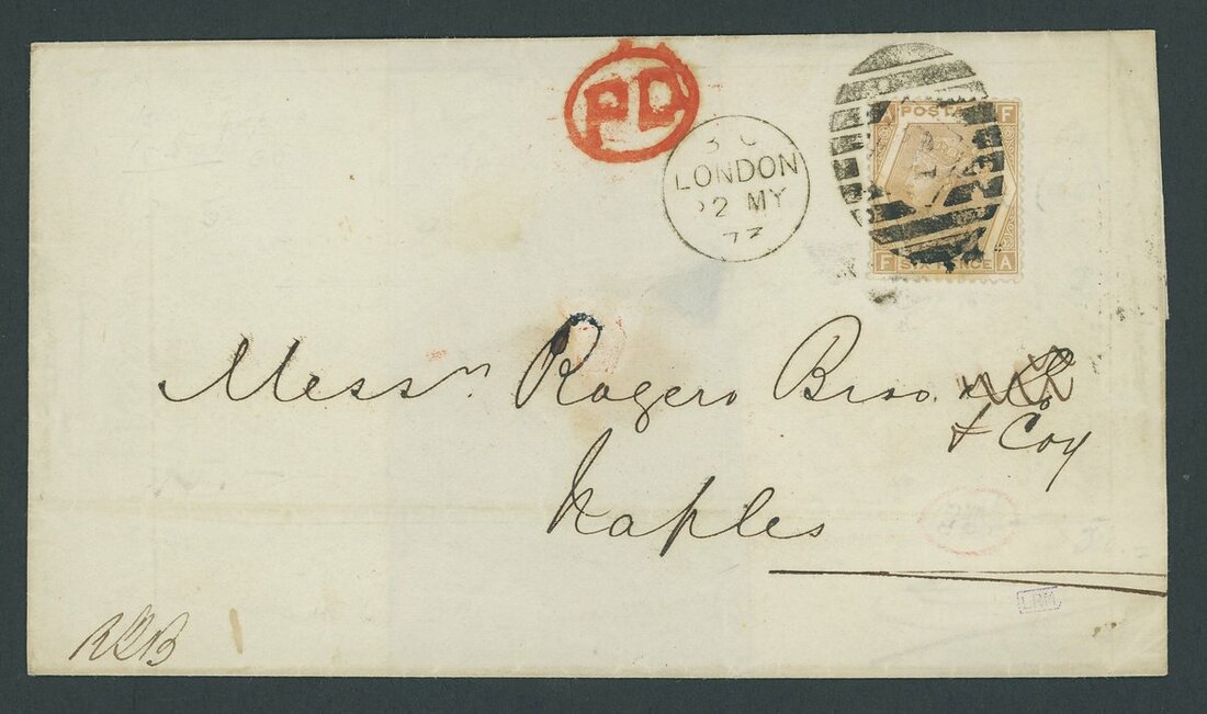 6d. pale buff, Plate 12, tied by London duplex cancellation of 22 May 1873 to entire to Naples with bold red PD in oval alongside; fine. S.G. 123. With R.P.S. Certificate (1988) (stating S.G. 124)