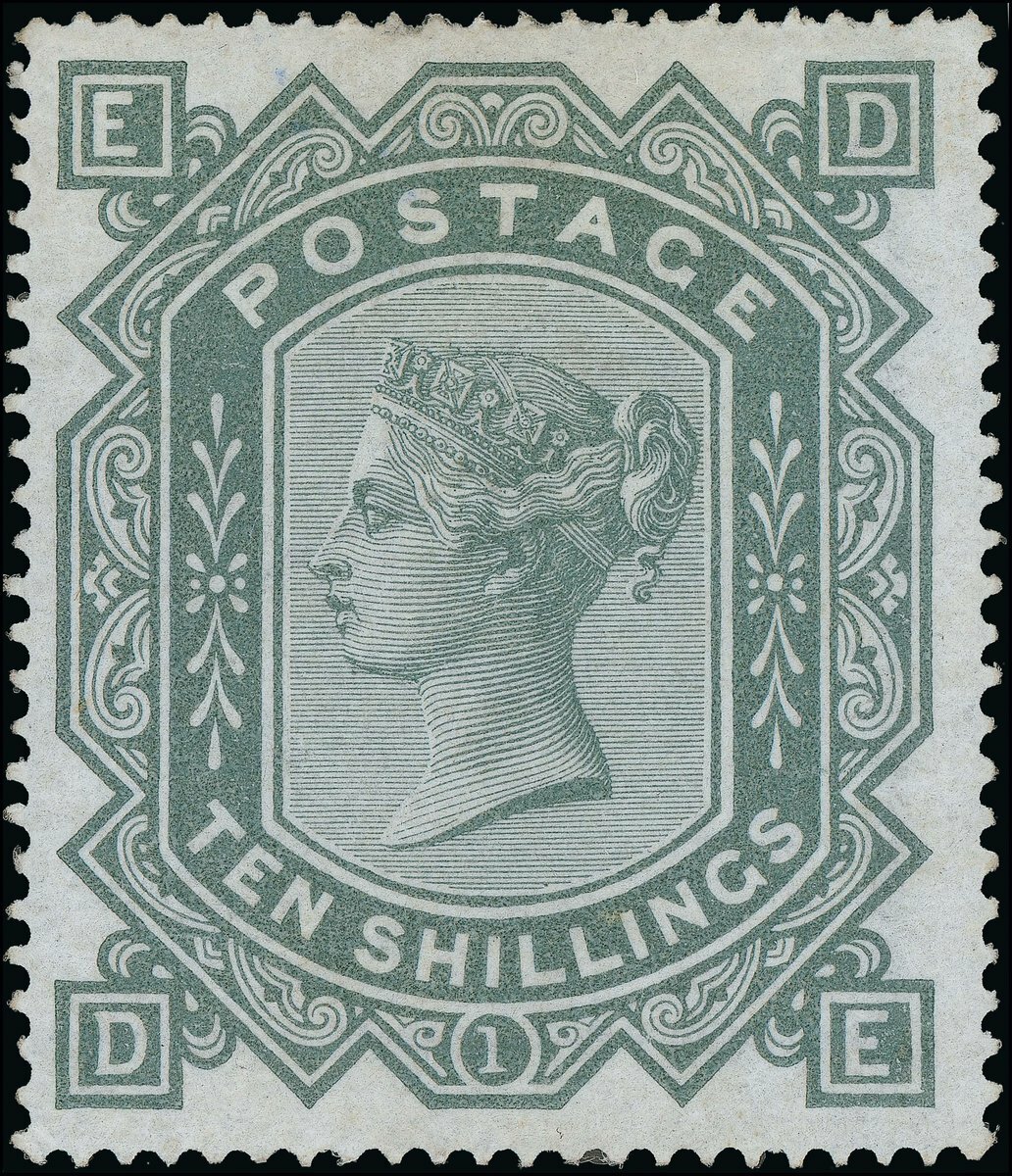 10/- greenish-grey, DE, large part original gum, fresh colour and exceptionally well centred. A marvellous example and must be considered a most important world rarity as such. One of the finest recorded examples known to exist. B.P.A. Certificate (1984). Spec. J124, S.G. 128, £40,000